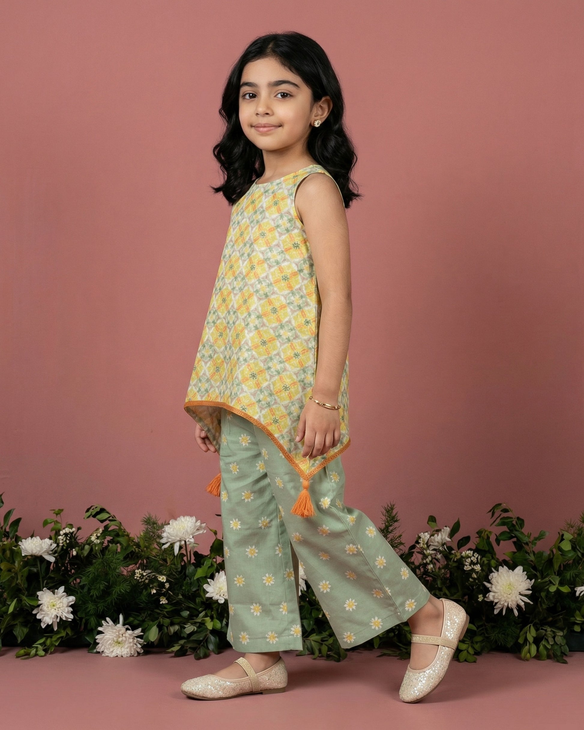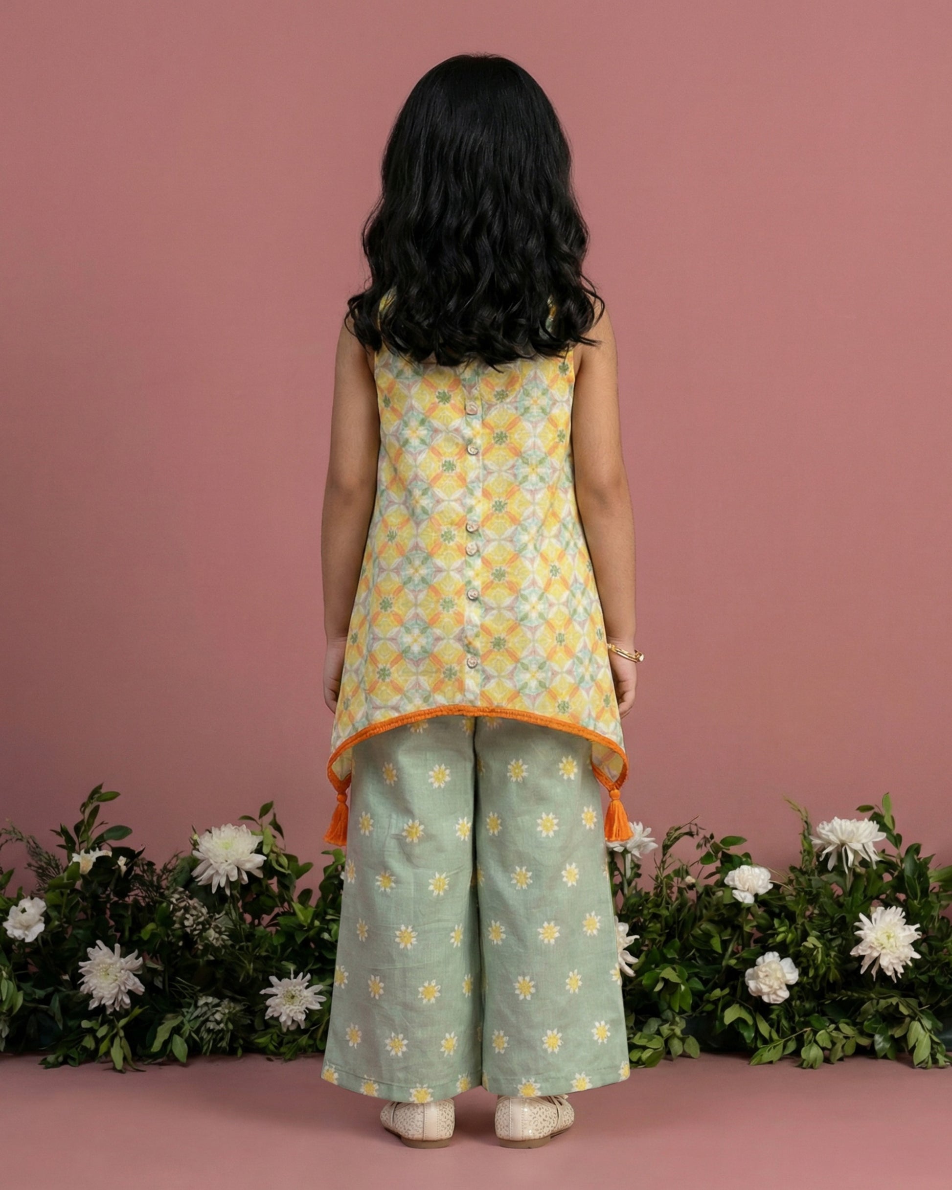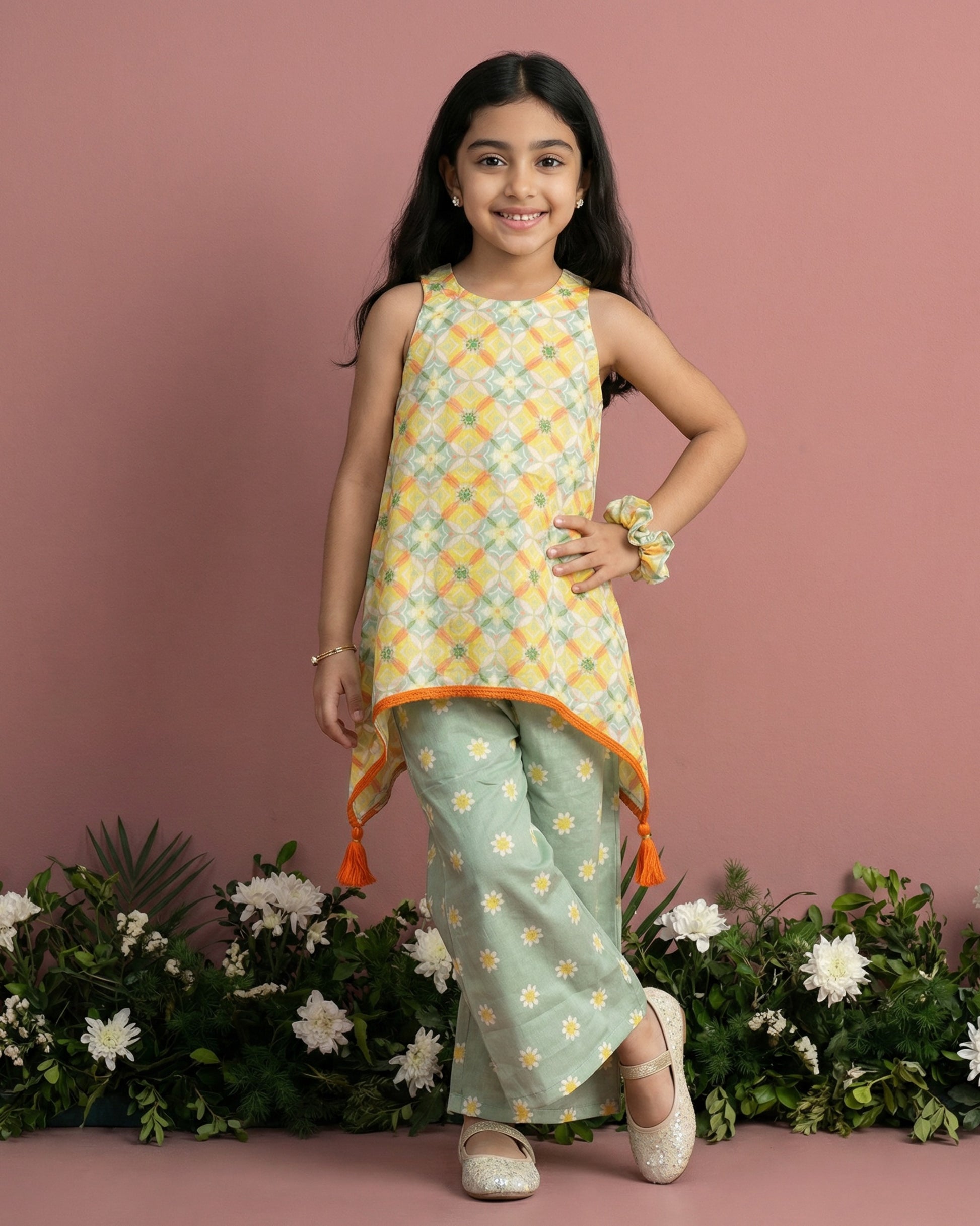 A fresh mint kurta-palazzo set featuring a soft geometric floral print on the kurta with a stylish high-low hem and back button closure for easy wear. Finished with contrast orange lace work and playful tassels at the sides. Paired with a comfy mint palazzo in an all-over daisy print—easy to wear, breezy and perfect for summer celebrations, birthdays and festive outings.
